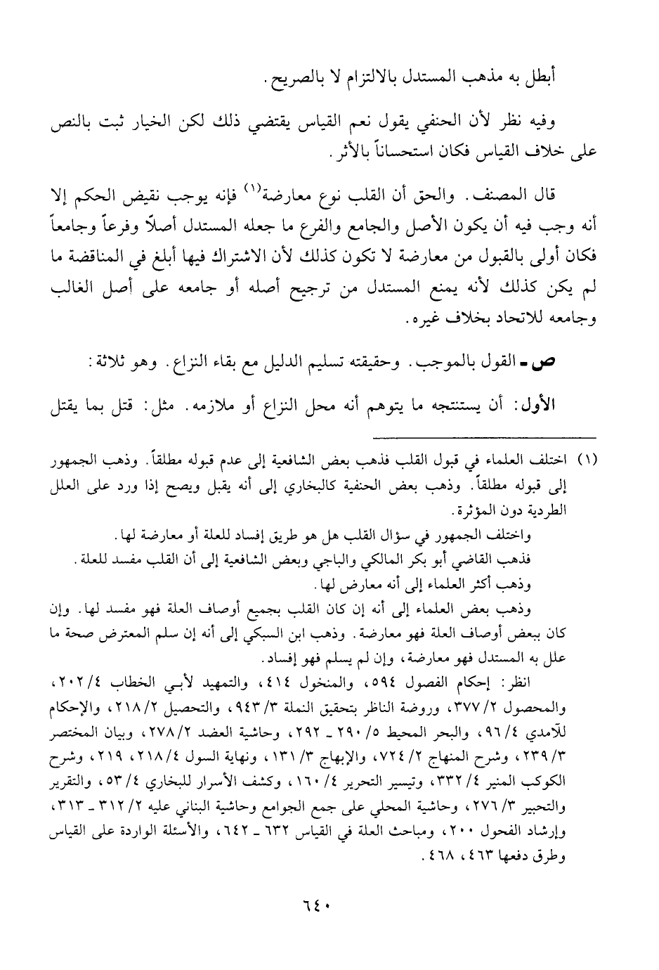 ص - القول بالموجب. وحقيقته تسليم الدليل مع بقاء النزاع. وهو ثلاثة: