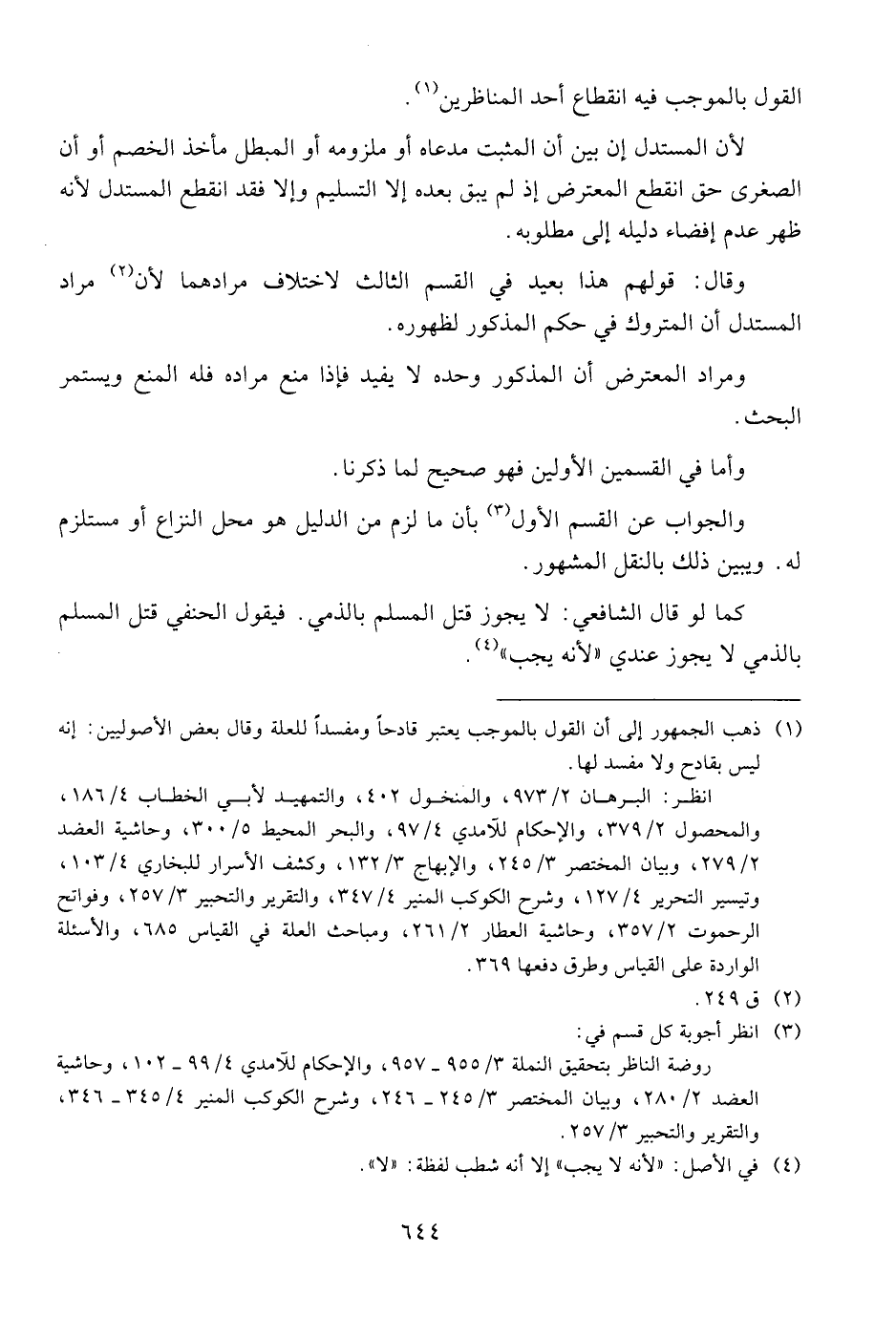 القول بالموجب فيه انقطاع أحد المناظرين.