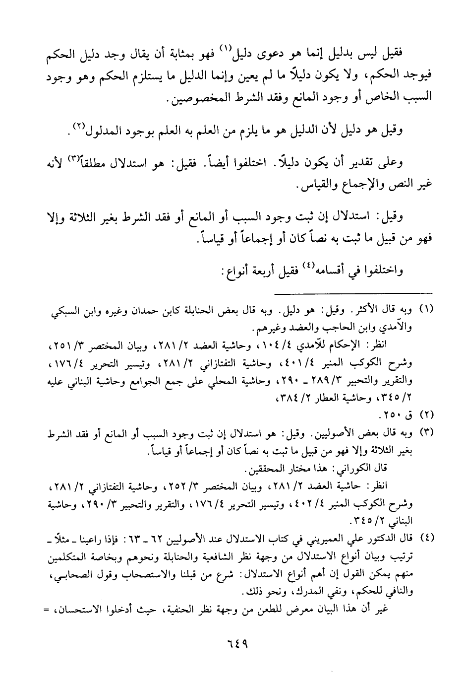 فقيل ليس بدليل إنما هو دعوى دليل فهو بمثابة أن يقال وجد دليل الحكم فيوجد الحكم , ولا يكون دليلا ما لم يعين وإنما الدليل ما يستلزم الحكم وهو وجود السبب الخاص أو وجود المانع وفقد الشرط المخصوصين.