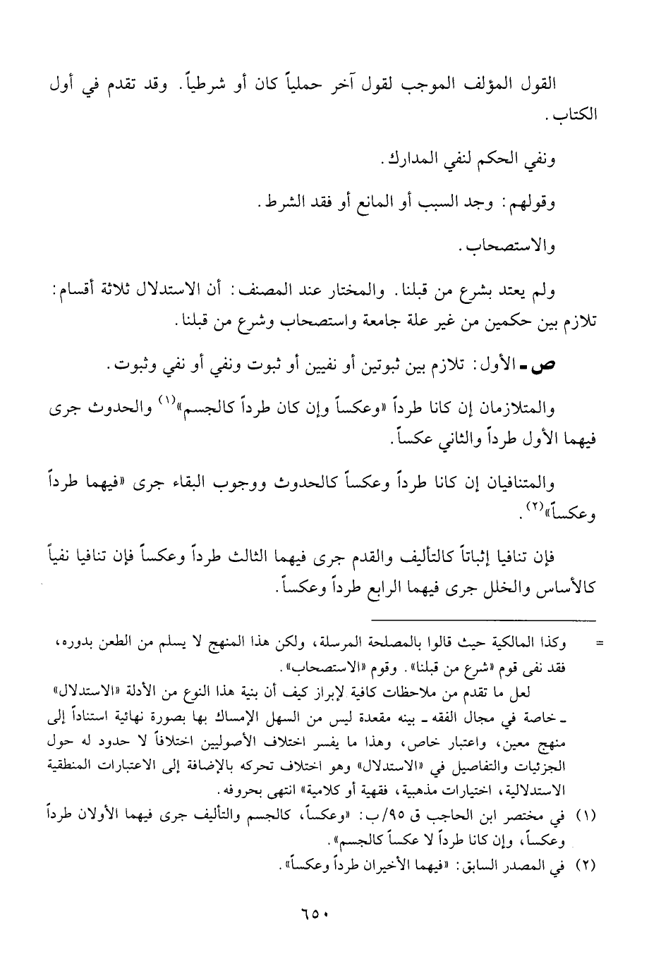 ص - الأول: تلازم بين ثبوتين أو نفيين أو ثبوت ونفي أو نفي وثبوت.