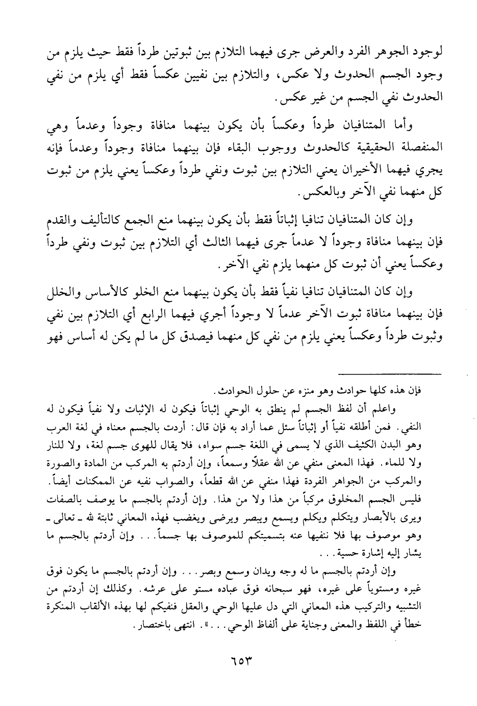 لوجود الجوهر الفرد والعرض جرى فيهما التلازم بين ثبوتين طردا فقط حيث يلزم من وجود الجسم الحدوث ولا عكس , والتلازم بين نفيين عكسا فقط أي يلزم من نفي الحدوث نفي الجسم من غير عكس.