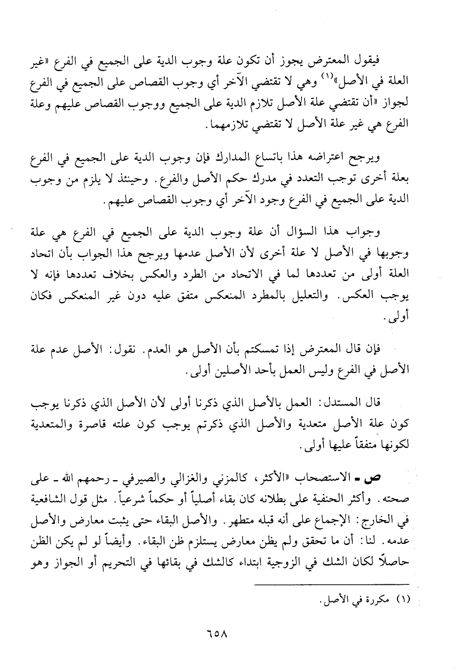 ويرجح اعتراضه هذا باتساع المدارك فإن وجوب الدية على الجميع في الفرع بعلة أخرى توجب التعدد في مدرك حكم الأصل والفرع. وحينئذ لا يلزم من وجوب الدية على الجميع في الفرع وجود الآخر أي وجوب القصاص عليهم.
