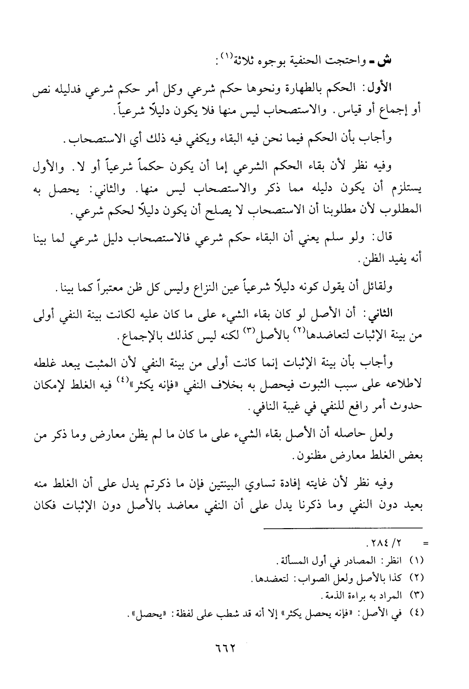 الأول: الحكم بالطهارة ونحوها حكم شرعي وكل أمر حكم شرعي فدليله نص أو إجماع أو قياس. والاستصحاب ليس منها فلا يكون دليلا شرعيا.