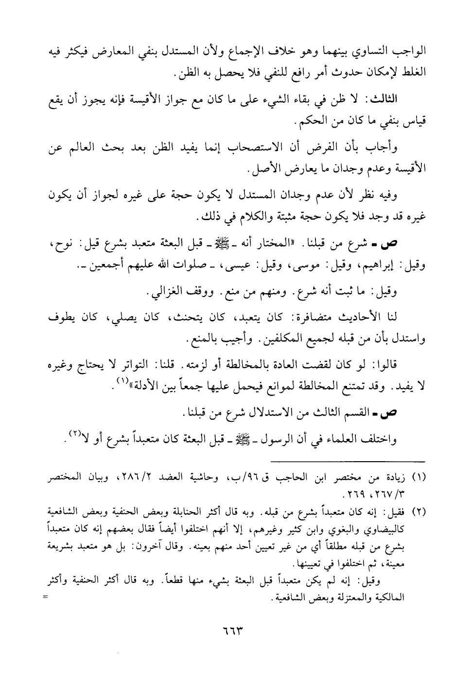 ص - شرع من قبلنا. " المختار أنه - صلى الله عليه وسلم - قبل البعثة متعبد شرع قيل: نوح , وقيل: إبراهيم , وقيل: موسى , وقيل: عيسى , - صلوات الله عليهم أجمعين -.