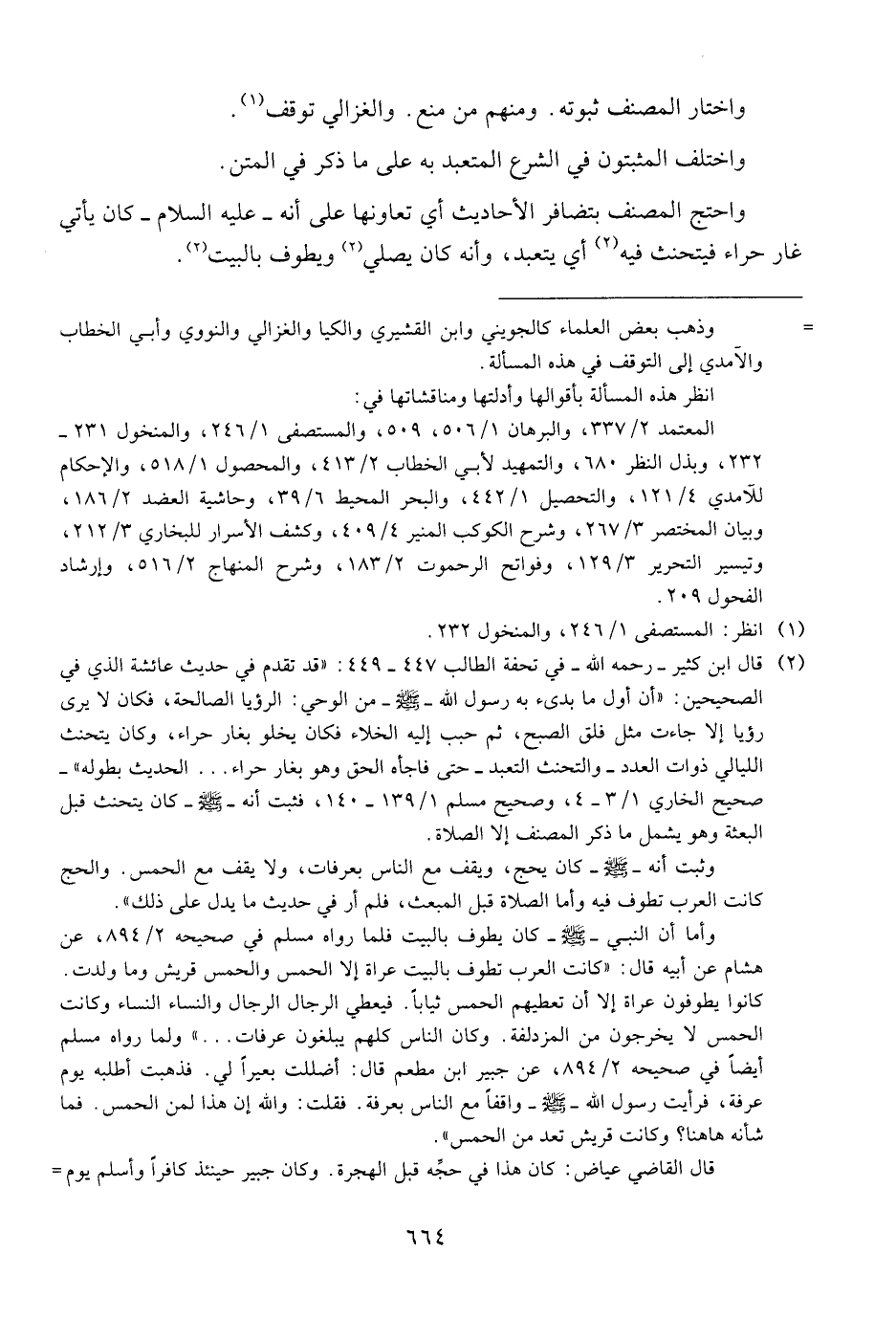 واحتج المصنف بتضافر الأحاديث أي تعاونها على أنه - عليه السلام - كان يأتي غار حراء فيتحنث فيه أي يتعبد , وأنه كان يصلي ويطوف بالبيت.
