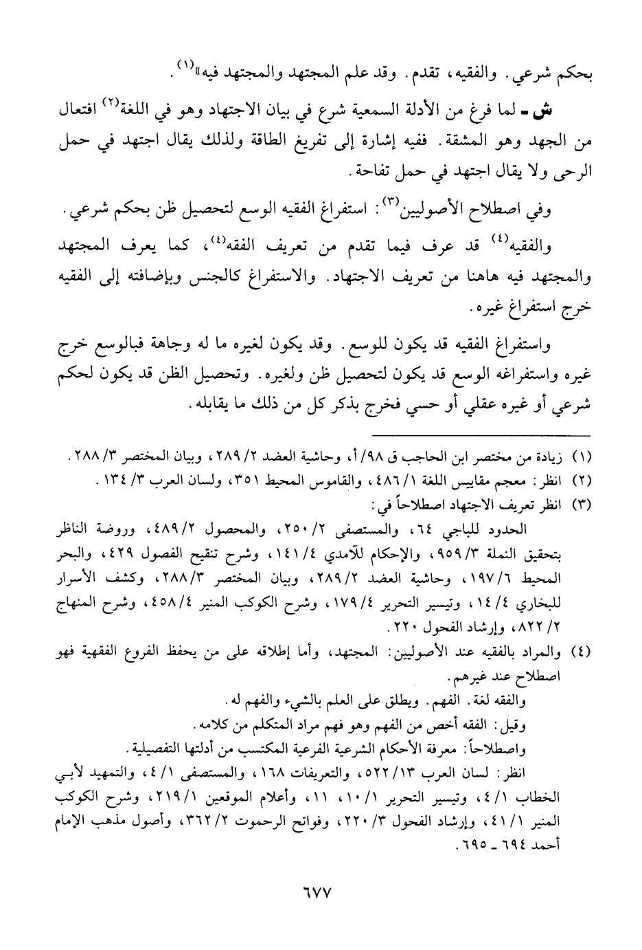 ش - لما فرع من الأدلة السمعية شرع في بيان الاجتهاد وهو في اللغة افتعال من الجهد وهو المشقة. ففيه إشارة إلى تفريغ الطاقة ولذلك يقال اجتهد في حمل الرحى ولا يقال اجتهد في حمل تفاحة.
