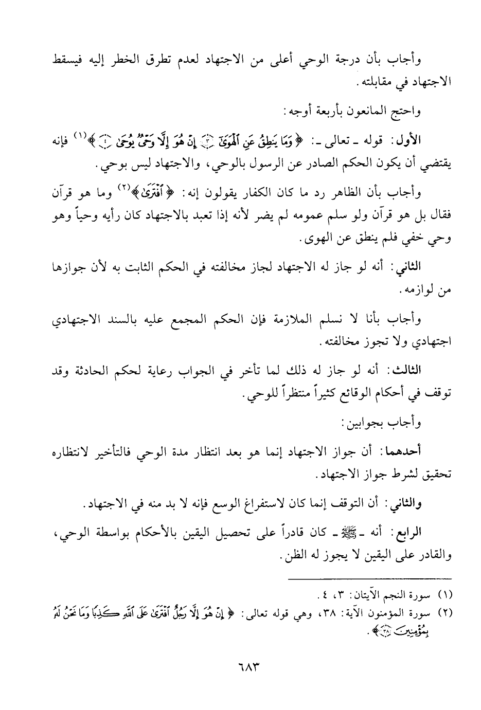 الأول: قوله - تعالى -: (وما ينطق عن الهوى إن هو إلا وحى يوحى) فإنه يقتضي أن يكون الحكم الصادر عن الرسول بالوحي , والاجتهاد ليس بوحي.