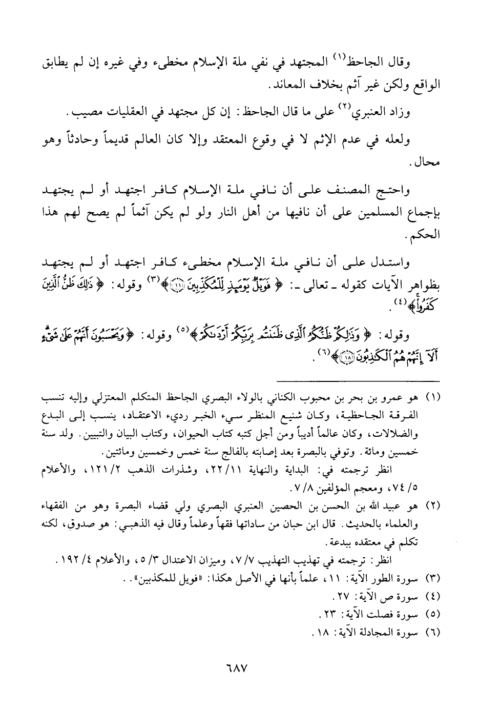 وقال الجاحظ المجتهد في نفي ملة الإسلام مخطئ وفي غيره إن لم يطابق الواقع ولكن غير آثم بخلاف المعاند.
