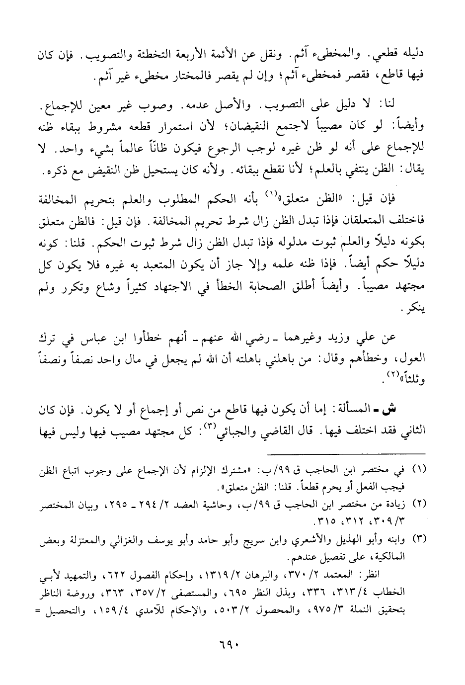 ش - المسألة: إما أن يكون فيها قاطع من نص أو إجماع أو لا يكون. فإن كان الثاني فقد اختلف فيها. قال القاضي والجبائي: كل مجتهد مصيب فيها وليس فيها