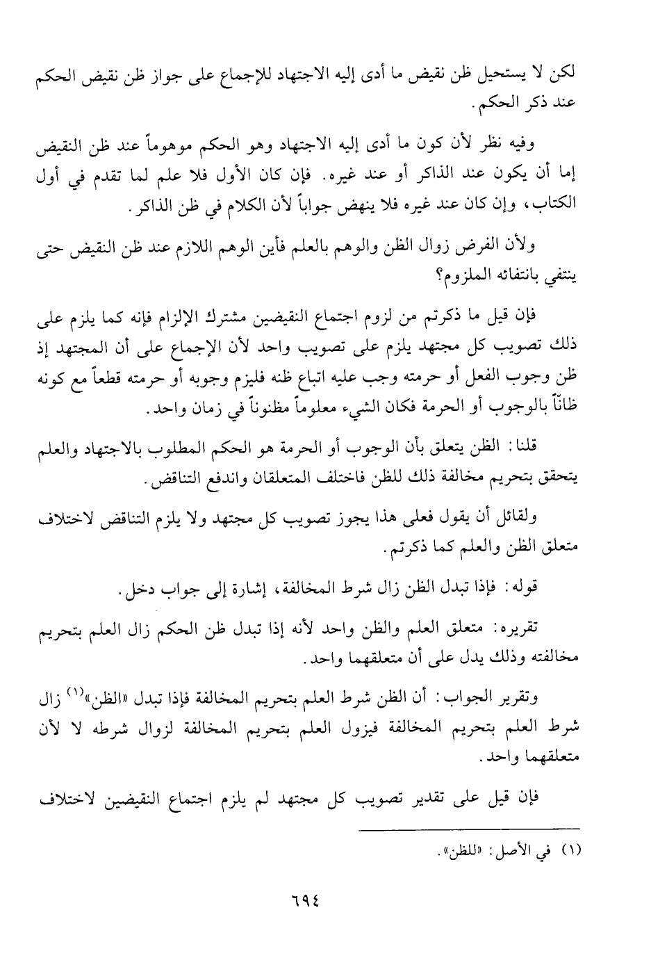 فإن قيل ما ذكرتم من لزوم اجتماع النقيضين مشترك الإلزام فإنه كما يلزم على ذلك تصويب كل مجتهد يلزم على تصويب واحد لأن الإجماع على أن المجتهد إذ ظن وجوب الفعل أو حرمته وجب عليه اتباع ظنه فليزم وجوبه أو حرمته قطعا مع كونه ظانا بالوجوب أو الحرمة فكان الشيء معلوما مظنونا في زمان واحد.