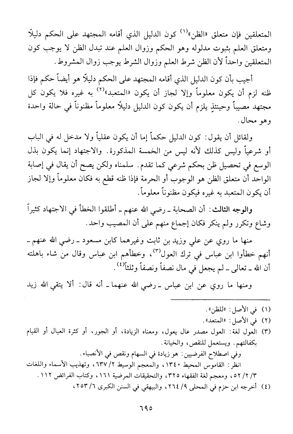منها ما روي عن علي وزيد بن ثابت وغيرهما كابن مسعود - رضي الله عنهم - أنهم خطأوا ابن عباس في ترك العول , وخطأهم ابن عباس وقال من شاء باهلته أن الله - تعالى - لم يجعل في مال نصفا ونصفا وثلثا.