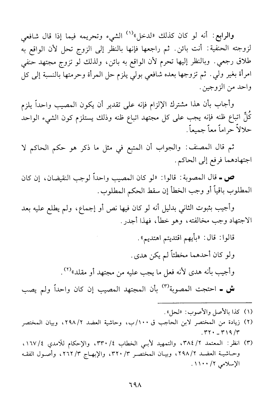 ص - قال المصوبة: قالوا: " لو كان المصيب واحدا لوجب النقيضان , إن كان المطلوب باقيا أو وجب الخطأ إن سقط الحكم المطلوب.