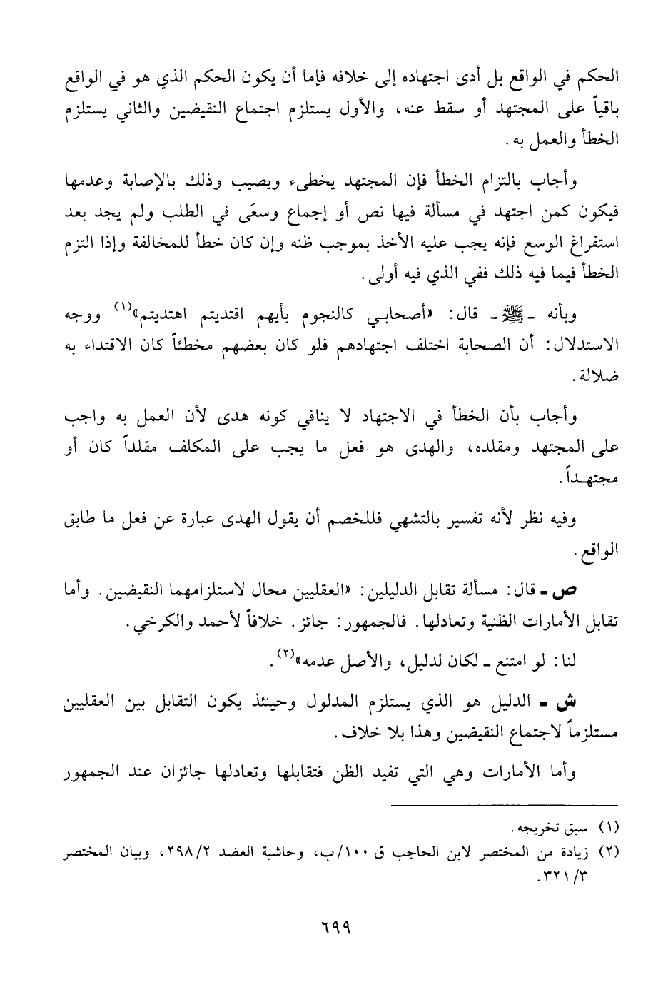 وبأنه - صلى الله عليه وسلم - قال: " أصحابي كالنجوم بأيهم اقتديتم اهتديتم " ووجه الاستدلال: أن الصحابة اختلف اجتهادهم فلو كان بعضهم مخطئا كان الاقتداء به ضلالة.