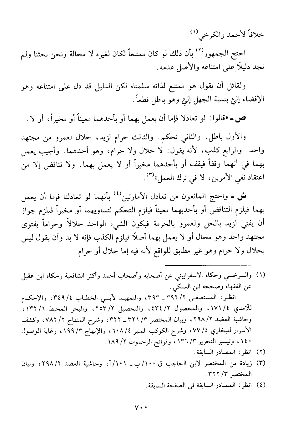 ش - واحتج المانعون من تعادل الأمارتين بأنهما لو تعادلتا فإما أن يعمل بهما فيلزم التناقض أو بأحدهما معينا فيلزم التحكم لتساويهما أو مخيرا فيلزم جواز أن يفتي لزيد بالحل ولعمرو بالحرمة فيكون الشيء الواحد حلالا وحراما بفتوى مجتهد واحد وهو محال أو لا يعمل بهما أصلا فيلزم الكذب فإنه لا بد وأن يقول ليس بحلال ولا حرام وهو غير مطابق للواقع لأنه فيه إما حلال أو حرام.