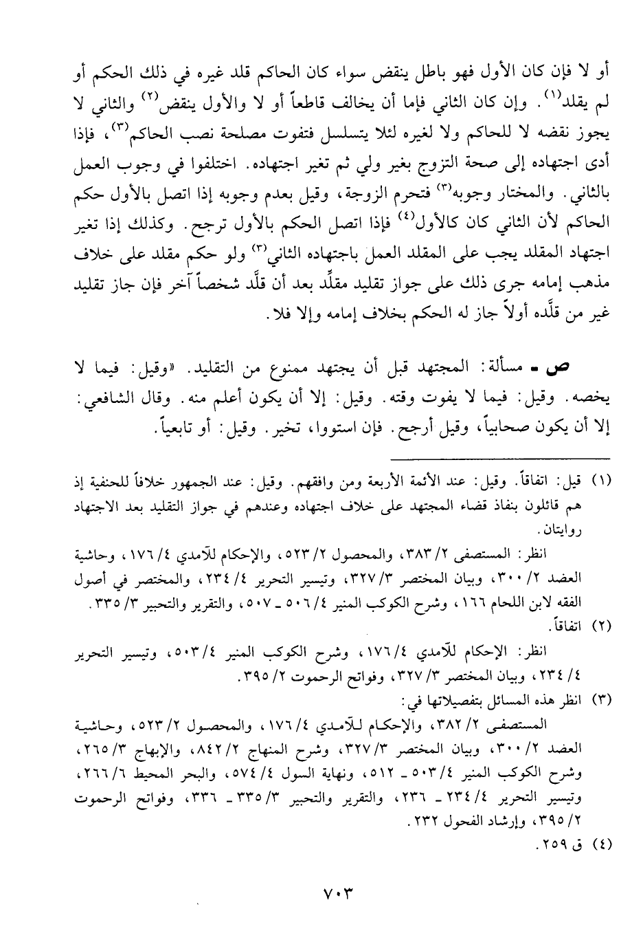أو لا فإن كان الأول فهو باطل ينقض سواء كان الحاكم قلد غيره في ذلك الحكم أو لم يقلد. وإن كان الثاني فإما أن يخالف قاطعا أو لا والأول ينقض والثاني لا يجوز نقضه لا للحاكم ولا لغيره لئلا يتسلسل فتفوت مصلحة نصب الحاكم , فإذا أدى اجتهاده إلى صحة التزوج بغير ولي ثم تغير اجتهاده. اختلفوا في وجوب العمل بالثاني. والمختار وجوبه فتحرم الزوجة , وقيل بعدم وجوبه إذا اتصل بالأول حكم الحاكم لأن الثاني كان كالأول فإذا اتصل الحكم بالأول ترجح. وكذلك إذا تغير اجتهاد المقلد يجب على المقلد العمل باجتهاد الثاني ولو حكم مقلد على خلاف مذهب إمامه جرى ذلك على جواز تقليد مقلد بعد أن قلد شخصا آخر فإن جاز تقليد غير من قلده أولا جاز له الحكم بخلاف إمامه وإلا فلا.