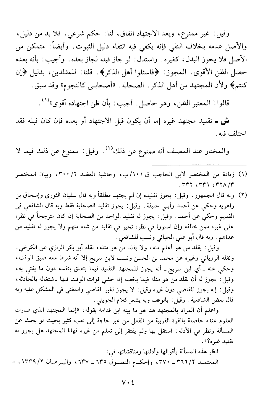 وقيل: غير ممنوع , وبعد الاجتهاد اتفاق , لنا: حكم شرعي , فلا بد من دليل , والأصل عدمه بخلاف النفي فإنه يكفي فيه انتفاء دليل الثبوت. وأيضا: متمكن من الأصل فلا يجوز البدل , كغيره. واستدل: لو جاز قبله لجاز بعده. وأجيب: بأنه بعده حصل الظن الأقوى. المجوز: (فاسئلوا أهل الذكر). قلنا: للمقلدين , بدليل (إن كنتم) ولأن المجتهد من أهل الذكر. الصحابة. " أصحابى كالنجوم " وقد سبق.