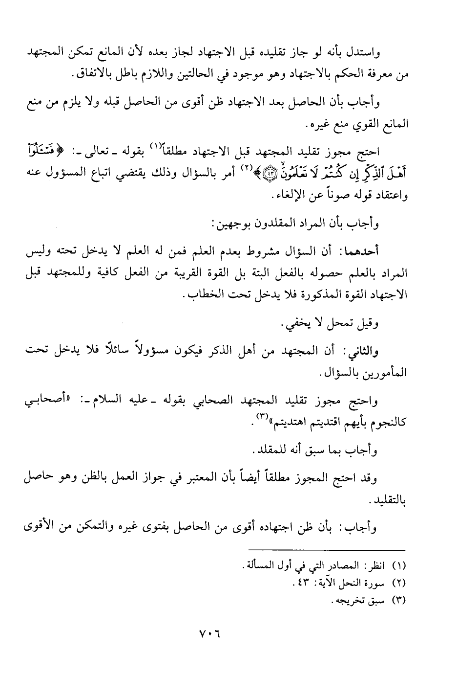 احتج مجوز تقليد المجتهد قبل الاجتهاد مطلقا بقوله - تعالى -: (فسئلوا أهل الذكر إن كنتم لا تعلمون) أمر بالسؤال وذلك يقتضي اتباع المسؤول عنه واعتقاد قوله صونا عن الإلغاء.