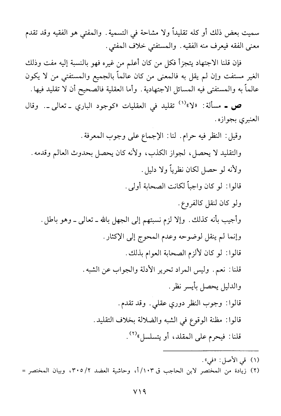 ص - مسألة: " لا " تقليد في العقليات " كوجود الباري - تعالى -. وقال العنبري بجوازه.