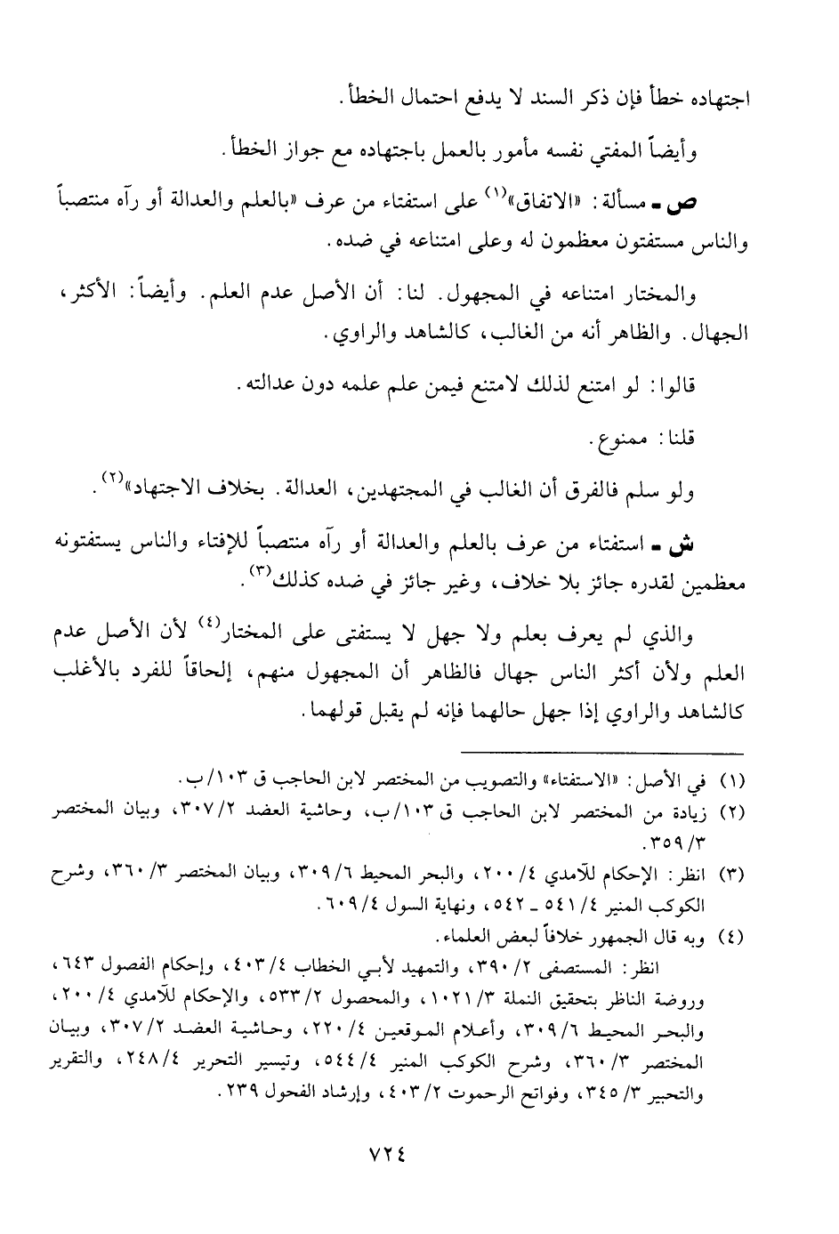 ص - مسألة: " الاتفاق " على استفتاء من عرف " بالعلم والعدالة أو رآه منتصبا والناس مستفتون معظمون له وعلى امتناعه في ضده.