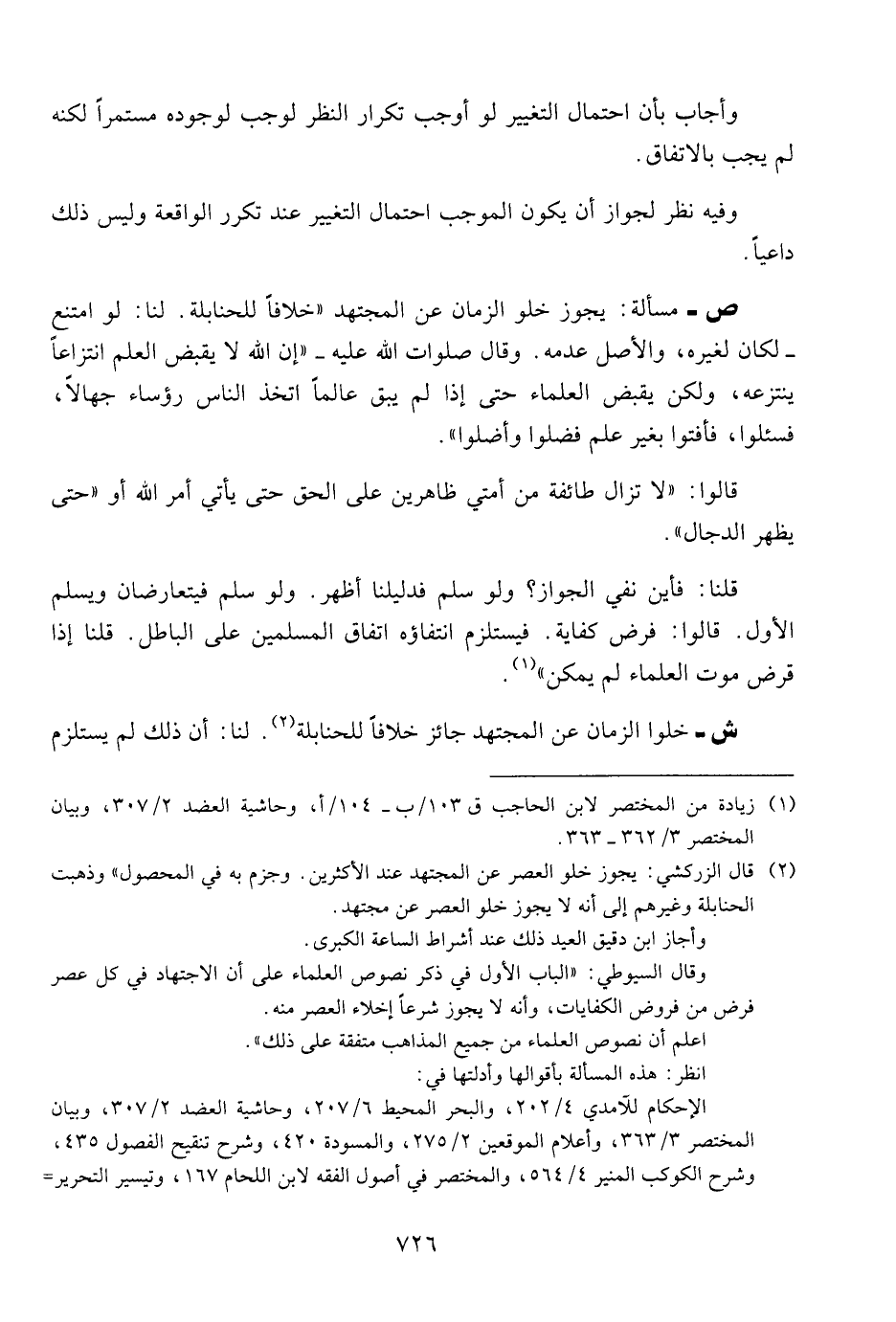 ص - مسألة: يجوز خلو الزمان عن المجتهد " خلافا للحنابلة. لنا: لو امتنع - لكان لغيره , والأصل عدمه. وقال صلوات الله عليه - " إن الله لا يقبض العلم انتزاعا ينتزعه , ولكن يقبض العلماء حتى إذا لم يبق عالما اتخذ الناس رؤساء جهالا , فسئلوا , فأفتوا بغير علم فضلوا وأضلوا ".