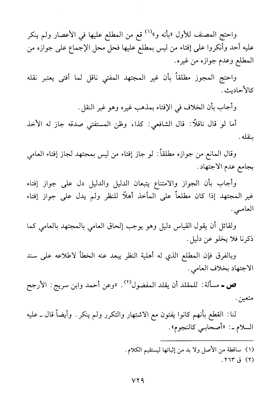 واحتج المصنف للأول " بأنه و " قع من المطلع عليها في الأعصار ولم ينكر عليه أحدا وأنكروا على إفتاء من ليس بمطلع عليها فحل محل الإجماع على جوازه من المطلع وعدم جوازه من غيره.