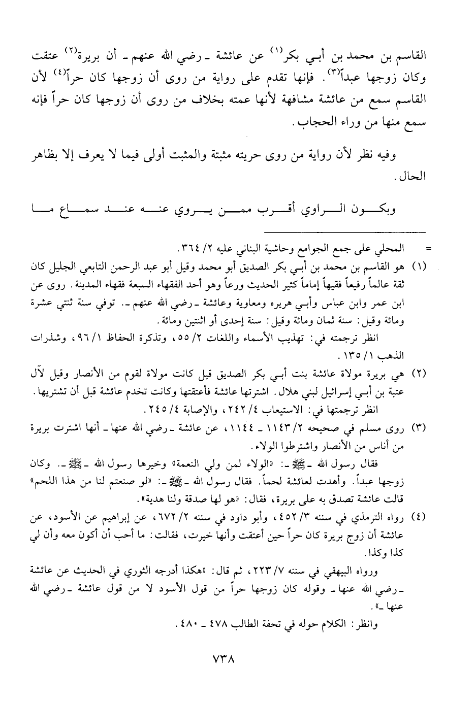 القاسم بن محمد بن أبي بكر عن عائشة - رضي الله عنهم - أن بريرة عتقت وكان زوجها عبدا. فإنها تقدم على رواية من روى أن زوجها كان حرا لأن القاسم سمع من عائشة مشافهة لأنها عمته بخلاف من روى أن زوجها كان حرا فإنه سمع منها من وراء الحجاب.