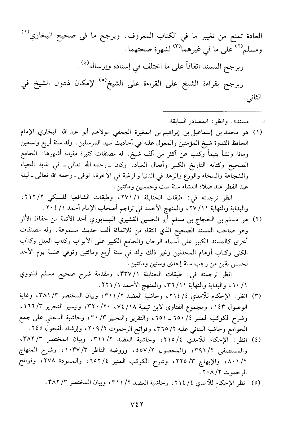 العادة تمنع من تغيير ما في الكتاب المعروف. ويرجح ما في صحيح البخاري ومسلم على ما في غيرهما لشهرة صحتهما.