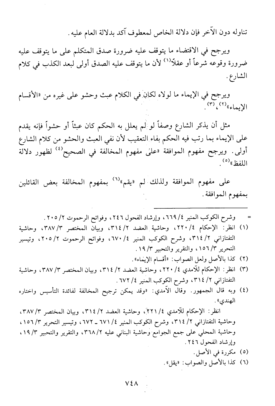 مثل أن يذكر الشارع وصفا لو لم يعلل به الحكم كان عبثا أو حشوا فإنه يقدم على الإيماء بما رتب فيه الحكم بفاء التعقيب لأن نفي العبث والحشو من كلام الشارع أولى. ويرجح مفهوم الموافقة " على مفهوم المخالفة في الصحيح لظهور دلالة اللفظ ".
