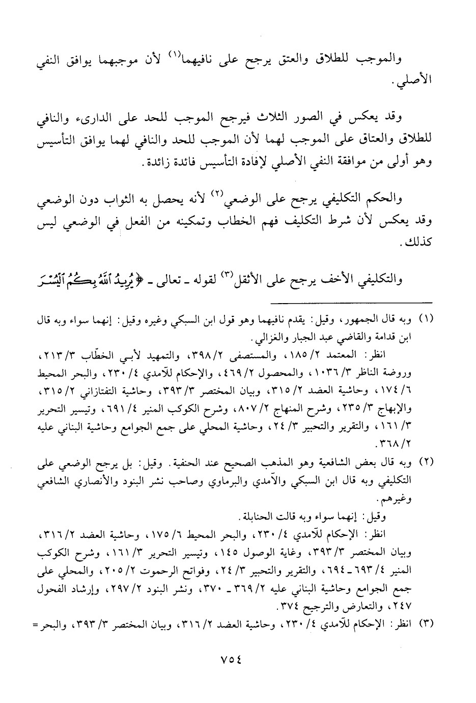 وقد يعكس في الصور الثلاث فيرجح الموجب للحد على الدارئ والنافي للطلاق والعتاق على الموجب لهما لأن الموجب للحد والنافي لهما يوافق التأسيس وهو أولى من موافقة النفي الأصلي لإفادة التأسيس فائدة زائدة.