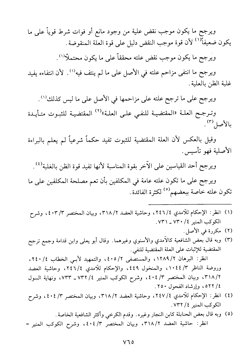 وترجح العلة " المقتضية للنفي على العلة " المقتضية للثبوت متأيدة بالأصل.