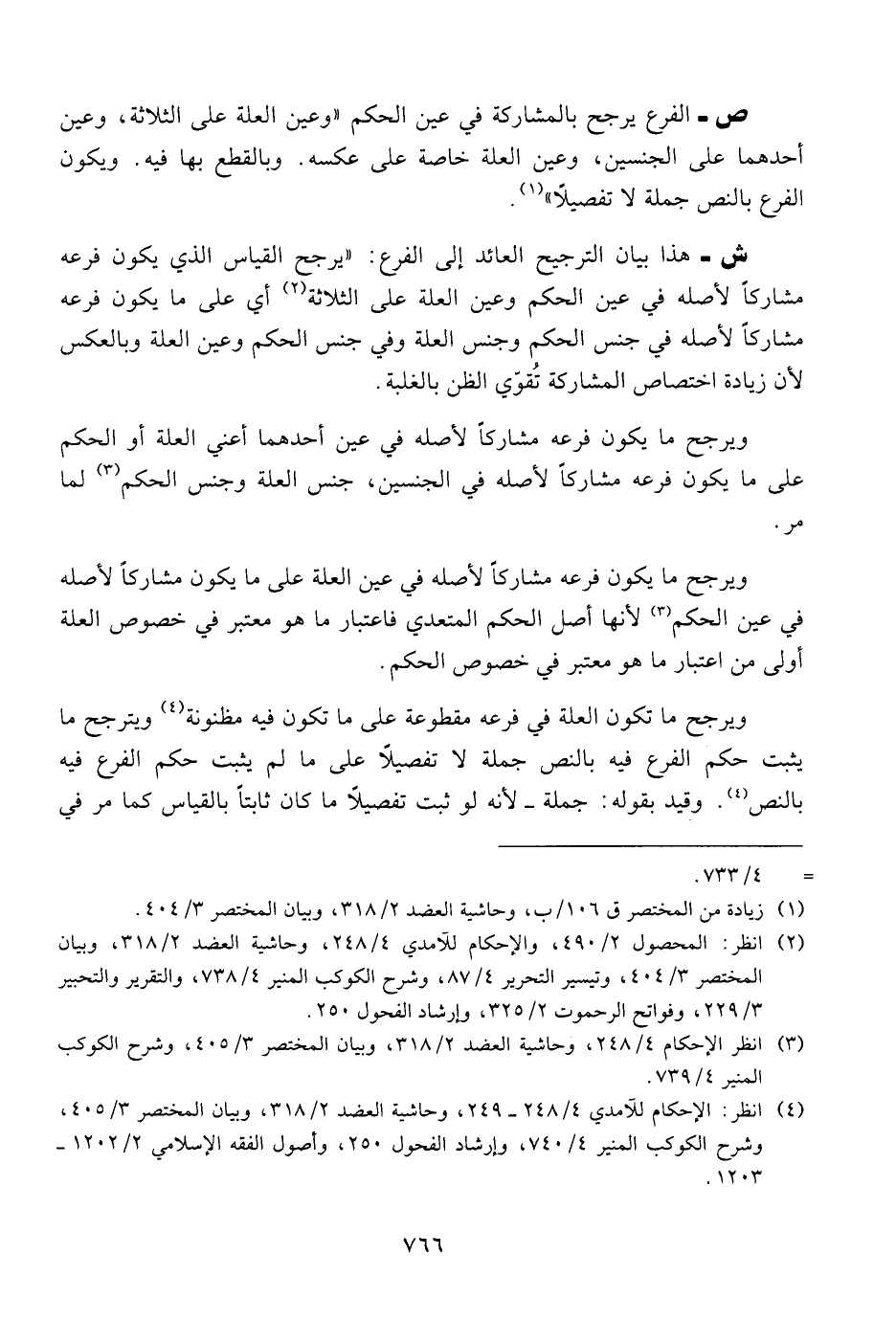 ص - الفرع يرجح بالمشاركة في عين الحكم " وعين العلة على الثلاثة، وعين أحدهما على الجنسين، وعين العلة خاصة على عكسه. وبالقطع بها فيه. ويكون الفرع بالنص جملة لا تفصيلا ".