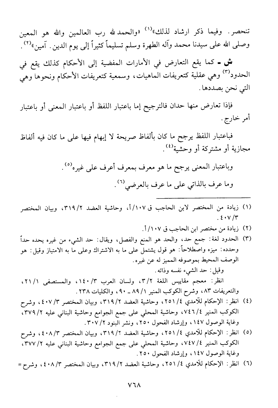 ش - كما يقع التعارض في الأمارات المفضية إلى الأحكام كذلك يقع في الحدود وهي عقلية كتعريفات الماهيات، وسمعية كتعريفات الأحكام ونحوها وهي التي نحن بصددها.