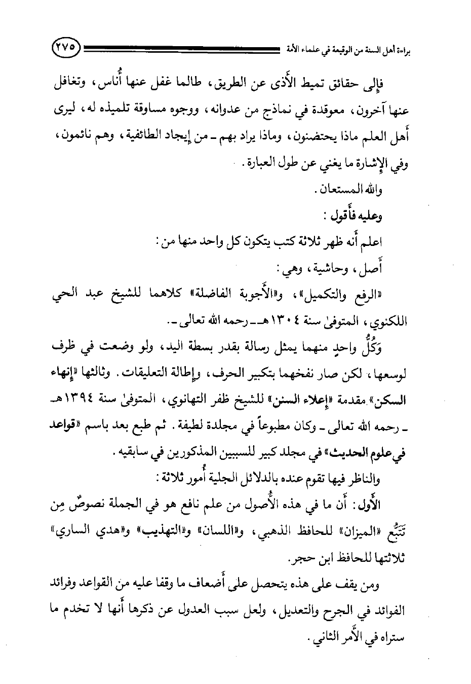 وَكُلُّ واحدٍ منهما يمثل رسالة بقدر بسطة اليد, ولو وضعت في ظرف لوسعها, لكن صار نفخهما بتكبير الحرف, وإِطالة التعليقات. وثالثها ((إِنهاء السكن)) مقدمة ((إِعلاء السنن)) للشيخ ظفر التهانوي, المتوفى سنة 1394هـ -رحمه الله تعالى- وكان مطبوعاً في مجلدة لطيفة. ثم طبع بعد باسم ((قواعد في علوم الحديث)) في مجلد كبير للسببين المذكورين في سابقيه.