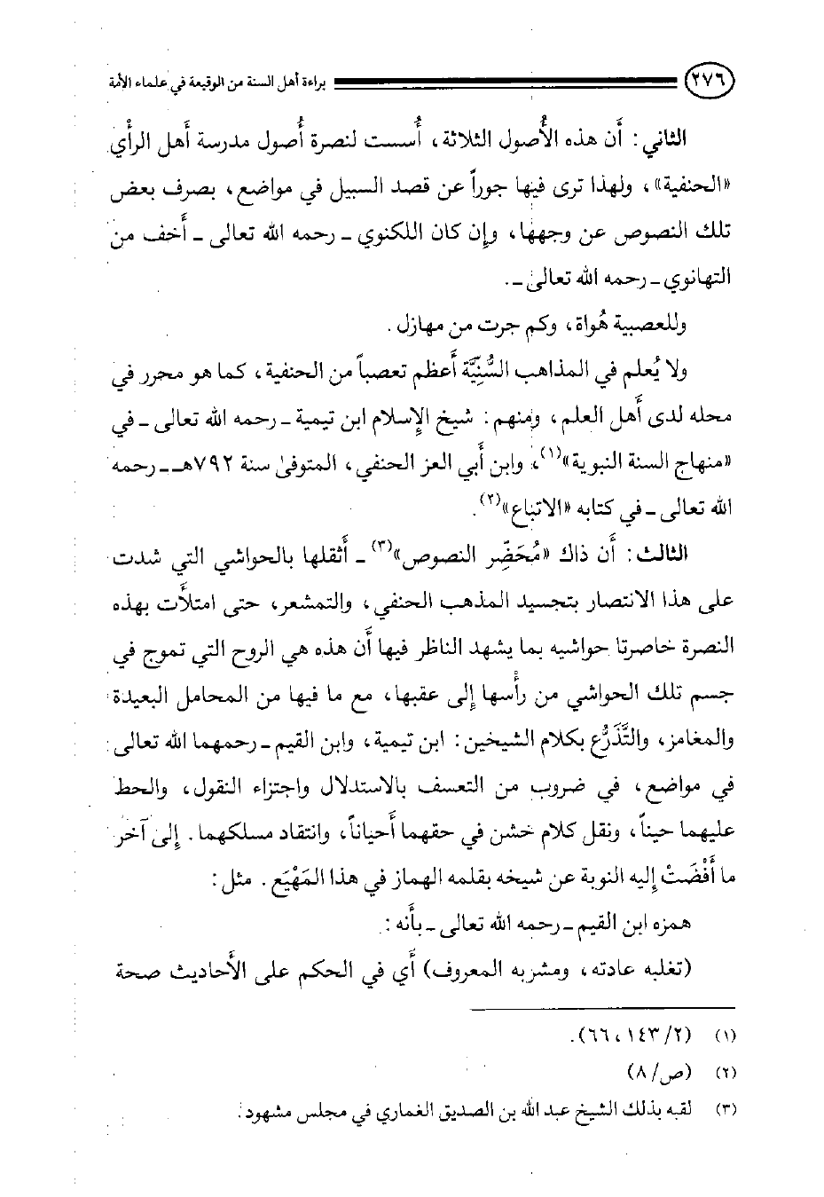 الثالث: أَن ذاك ((مُحَضِّر النصوص)) (¬3) - أَثقلها بالحواشي التي شدت على هذا الانتصار بتجسيد المذهب الحنفي, والتمشعر, حتى امتلأَت بهذه النصرة خاصرتا حواشيه بما يشهد الناظر فيها أَن هذه هي الروح التي تموج في جسم تلك الحواشي من رأْسها إِلى عقبها, مع ما فيها من المحامل البعيدة والمغامز, والتَّذَرُّع بكلام الشيخين: ابن تيمية, وابن القيم - رحمهما الله تعالى - في مواضع, في ضروب من التعسف بالاستدلال واجتراء النقول, والحط عليهما حيناً, ونقل كلام خشن في حقهما أَحياناً, وانتقاد مسلكهما. إِلى آخر ما أَفْضَتْ إِليه النوبة عن شيخه بقلمه الهماز في هذا المَهْيَع. مثل: