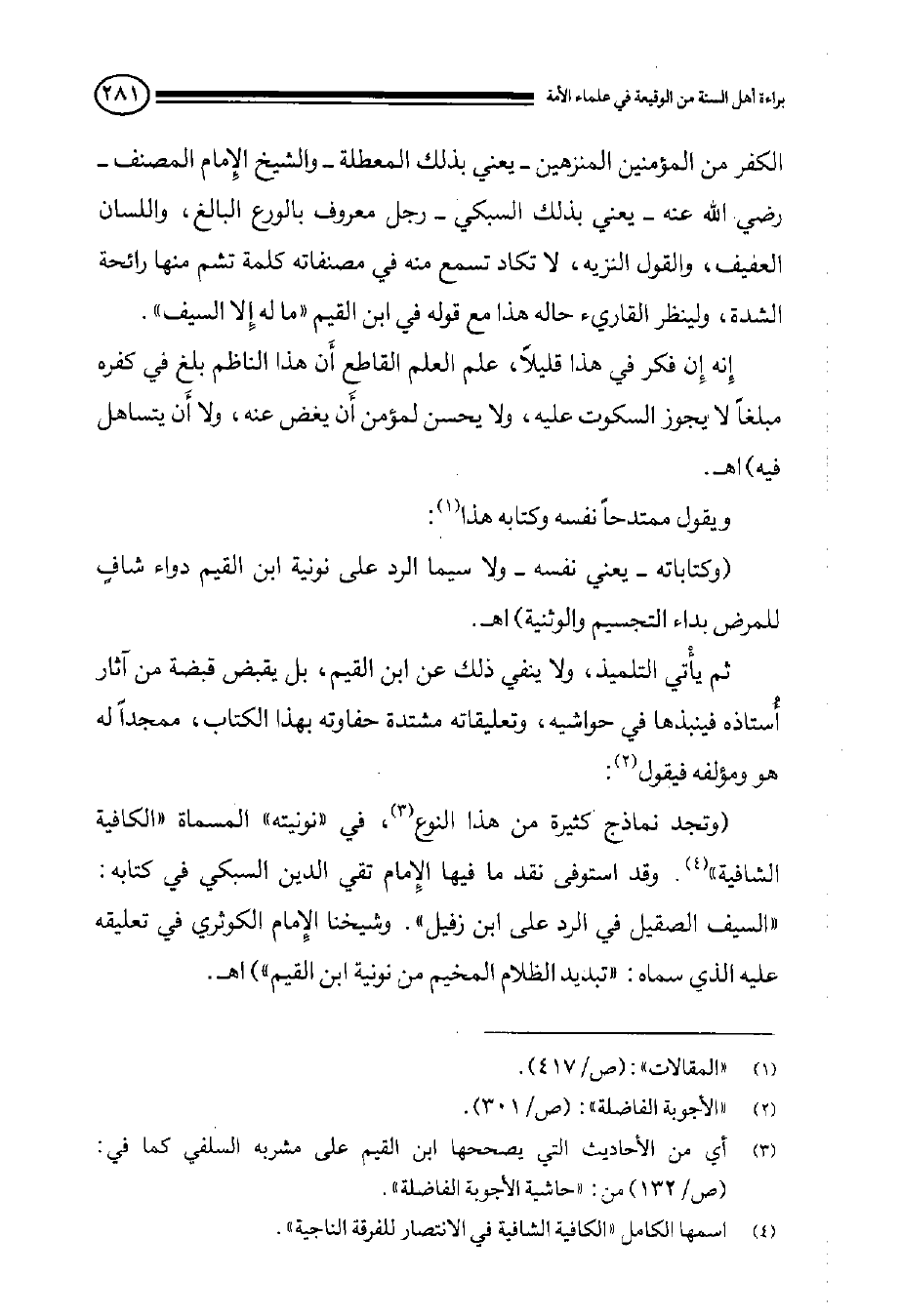 (وتجد نماذج كثيرة من هذا النوع (¬3) , في ((نونيته)) المسماة ((الكافية الشافية)) (¬4) . وقد استوفى نقد ما فيها الإِمام تقي الدين السبكي في كتابه: ((السيف الصقيل في الرد على ابن زفيل)) . وشيخنا الإِمام الكوثري في تعليقه عليه الذي سماه: ((تبديد الظلام المخيم على نونية ابن القيم)) اهـ.