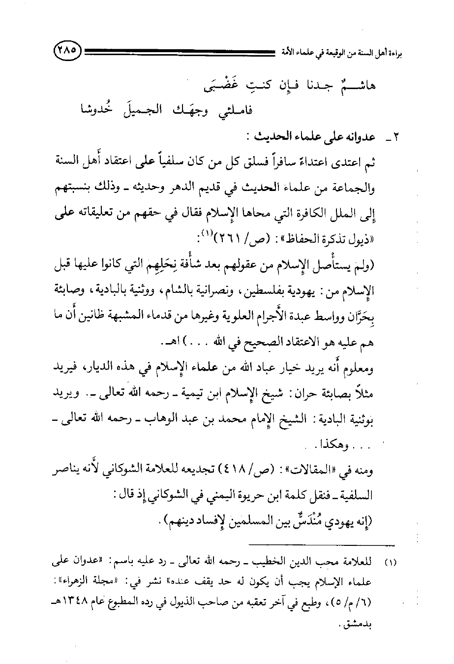 (¬1) للعلامة محب الدين الخطيب -رحمه الله تعالى- رد عليه باسم: ((عدوان على علماء الإِسلام يجب أَن يكون له حد يقف عنده)) نشر في: ((مجلة الزهراء)) : (6 / م / 5) , وطبع في آخر تعقبه من صاحب الذيول في رده المطبوع عام 1348هـ بدمشق.