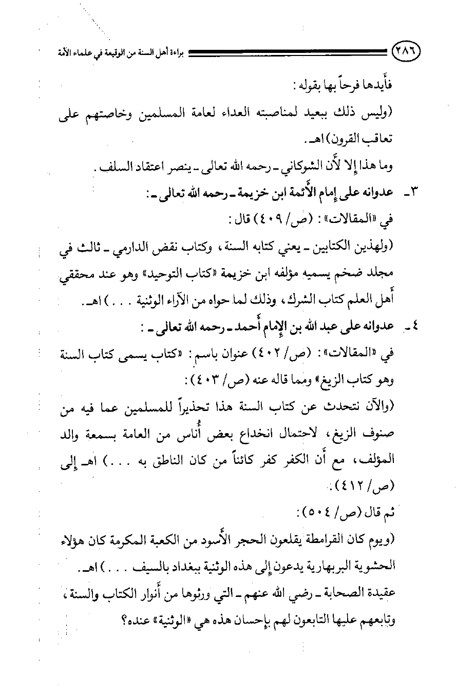 (ويوم كان القرامطة يقلعون الحجر الأَسود من الكعبة المكرمة كان هؤلاء الحشوية البربهارية يدعون إِلى هذه الوثنية ببغداد بالسيف. . .) اهـ.