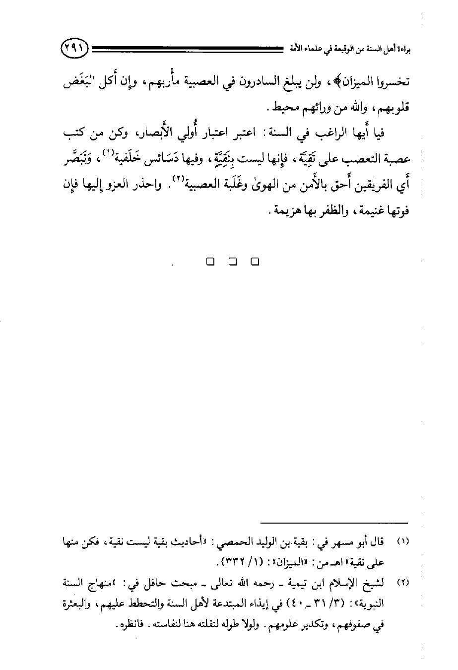 تُخْسِرُوا الْمِيزَانَ} , ولن يبلغ السادرون في العصبية مأْربهم, وإِن أَكل البَغَض قلوبهم, والله من ورائهم محيط. فيا أَيها الراغب في السنة: اعتبر اعتبار أُولي الأَبصار, وكن من كتب عصبة التعصب على تَقِيَّة, فإِنها ليست بِنَقِيَّةٍ, وفيها دَسَائس خَلَفية (¬1) , وَتَبَصَّر أَي الفريقين أَحق بالأَمن من الهوى وغَلَبة العصبية (¬2) واحذر العزو إِليها فإِن فوتها غنيمة, والظفر بها هزيمة.