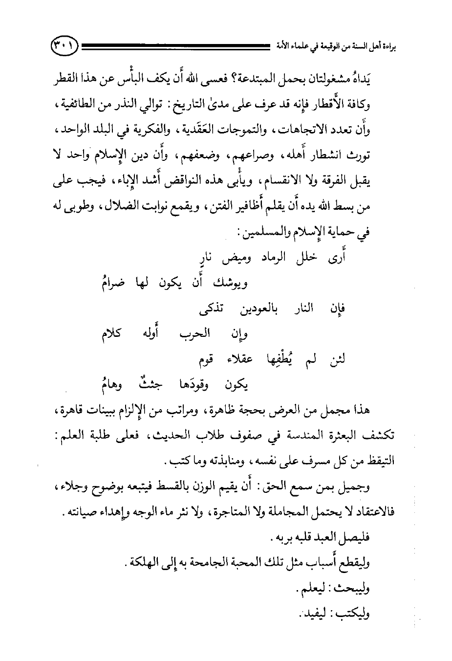 هذا مجمل من العرض بحجة ظاهرة, ومراتب من الإِلزام ببيانات قاهرة, تكشف البعثرة المندسة في صفوف طلاب الحديث, فعلى طلبة العلم: التيقظ من كل مسرف على نفسه, ومنابذته وما كتب. وجميل بمن سمع الحق: أَن يقيم الوزن بالقسط فيتبعه بوضوح وجلاء, فالاعتقاد لا يحتمل المجاملة ولا المتاجرة, ولا نثر ماء الوجه وإِهداء صيانته. فليصل العبد قلبه بربه. وليقطع أَسباب مثل تلك المحبة الجامحة به إِلى الهلكة. وليبحث: ليعلم. وليكتب: ليفيد.