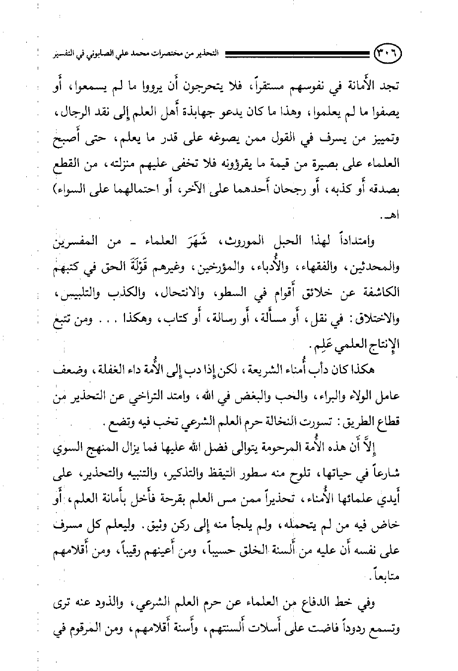 تجد الأَمانة في نفوسهم مستقراً, فلا يتحرجون أَن يرووا ما لم يسمعوا, أَو يصفوا ما لم يعملوا, وهذا ما كان يدعو جهابذة أَهل العلم إِلى نقد الرجال, وتمييز من يسرف في القول ممن يصوغه على قدر ما يعلم, حتى أَصبح العلماء على بصيرة من قيمة ما يقرؤونه فلا تخفى عليهم منزلته, من القطع بصدقه أَو كذبه, أَو رجحان أَحدهما على الآخر, أَو احتمالهما على السواء) اهـ. وامتداداً لهذا الحبل الموروث, شَهَرَ العلماء – من المفسرين والمحدثين, والفقهاء, والأُدباء, والمؤرخين, وغيرهم قَوْلَةَ الحق في كتبهم الكاشفة عن خلائق أَقوام في السطو, والانتحال, والكذب والتلبيس, والاختلاق: في نقل, أَو مسأَلة, أَو رسالة, أَو كتاب, وهكذا... ومن تتبع الإَنتاج العلمي عَلِم. هكذا كان دأب أٌمناء الشريعة, لكن إِذا دب إِلى الأُمة داء الغفلة, وضعف عامل الولاء والبراء, والحب والبغض في الله, وامتد التراخي عن التحذير من قطاع الطريق: تسورت النخالة حرم العلم الشرعي تخب فيه وتضع. إِلاَّ أَن هذه الأُمة المرحومة يتوالى فضل الله عليها فما يزال المنهج السوي شارعاً في حياتها, تلوح منه سطور التيقظ والتذكير, والتنبيه والتحذير, على أَيدي علمائها الأُمناء, تحذيراً ممن مس العلم بقرحة فأَخل بأَمانة العلم, أَو خاض فيه من لم يتحمله, ولم يلجأ منه إِلى ركن وثيق. وليعلم كل مسرف على نفسه أَن عليه من أَلسنة الخلق حسيباً, ومن أَعينهم رقيباً, ومن أَقلامهم متابعاً. وفي خط الدفاع من العلماء عن حرم العلم الشرعي, والذود عنه ترى وتسمع ردوداً فاضت على أَسلات أَلسنتهم, وأَسنة أَقلامهم, ومن المرقوم في