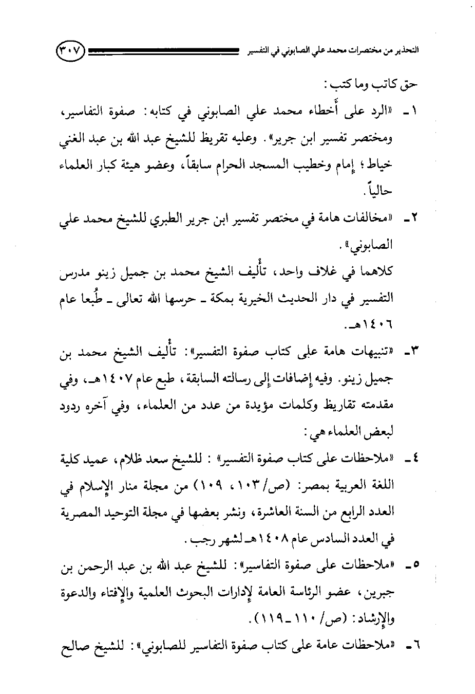 5- ((ملاحظات على صفوة التفاسير)) : للشيخ عبد الله بن عبد الرحمن بن جبرين, عضو الرئاسة العامة لإِدارات البحوث العلمية والإِفتاء والدعوة والإِرشاد: (ص /110 , 119)