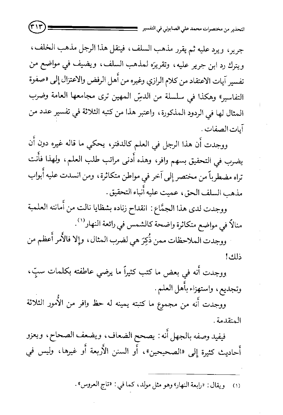 جرير, ويرد عليه ثم يقرر مذهب السلف, فينقل هذا الرجل مذهب الخلف, ويترك رد ابن جرير عليه, وتقريره لمذهب السلف, ويضيف في مواضع من تفسير آيات الاعتقاد من كلام الرازي وغيره من أَهل الرفض والاعتزال إلى ((صفوة التفاسير)) وهكذا في سلسلة من الدسِّ المهين ترى مجامعها العامة وضرب المثال لها في الردود المذكورة, واعتبر هذا من كتبه الثلاثة في تفسير عدد من آيات الصفات.