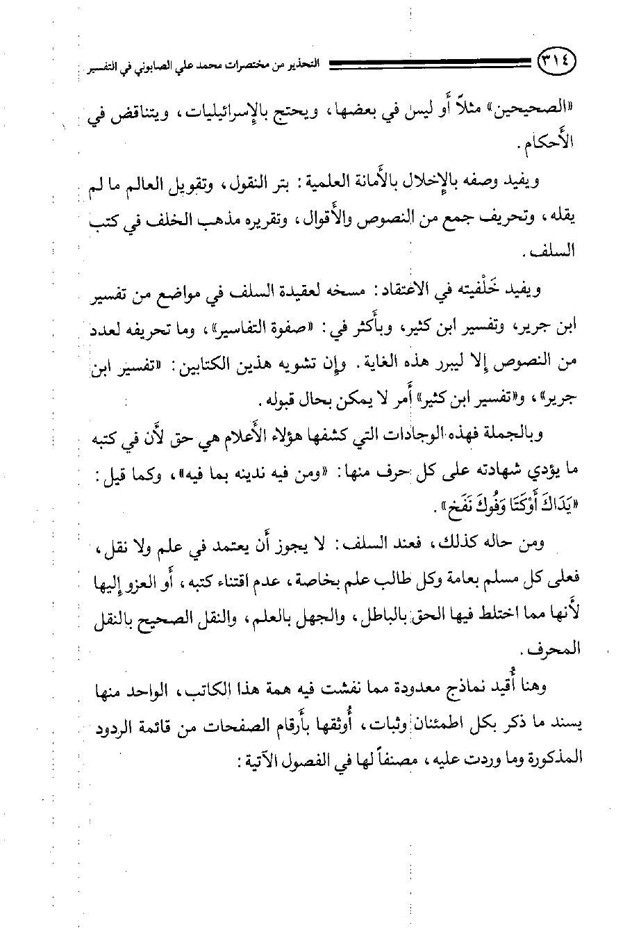 ويفيد خًلْفيته في الاعتقاد: مسخه لعقيدة السلف في مواضع من تفسير ابن جرير, وتفسير ابن كثير, وبأَكثر في: ((صفوة التفاسير)) , وما تحريفه لعدد من النصوص إِلا ليبرر هذه الغاية. وإِن تشويه هذين الكتابين: ((تفسير ابن جرير)) , و ((تفسير ابن كثير)) أَمر لا يمكن بحال قبوله.