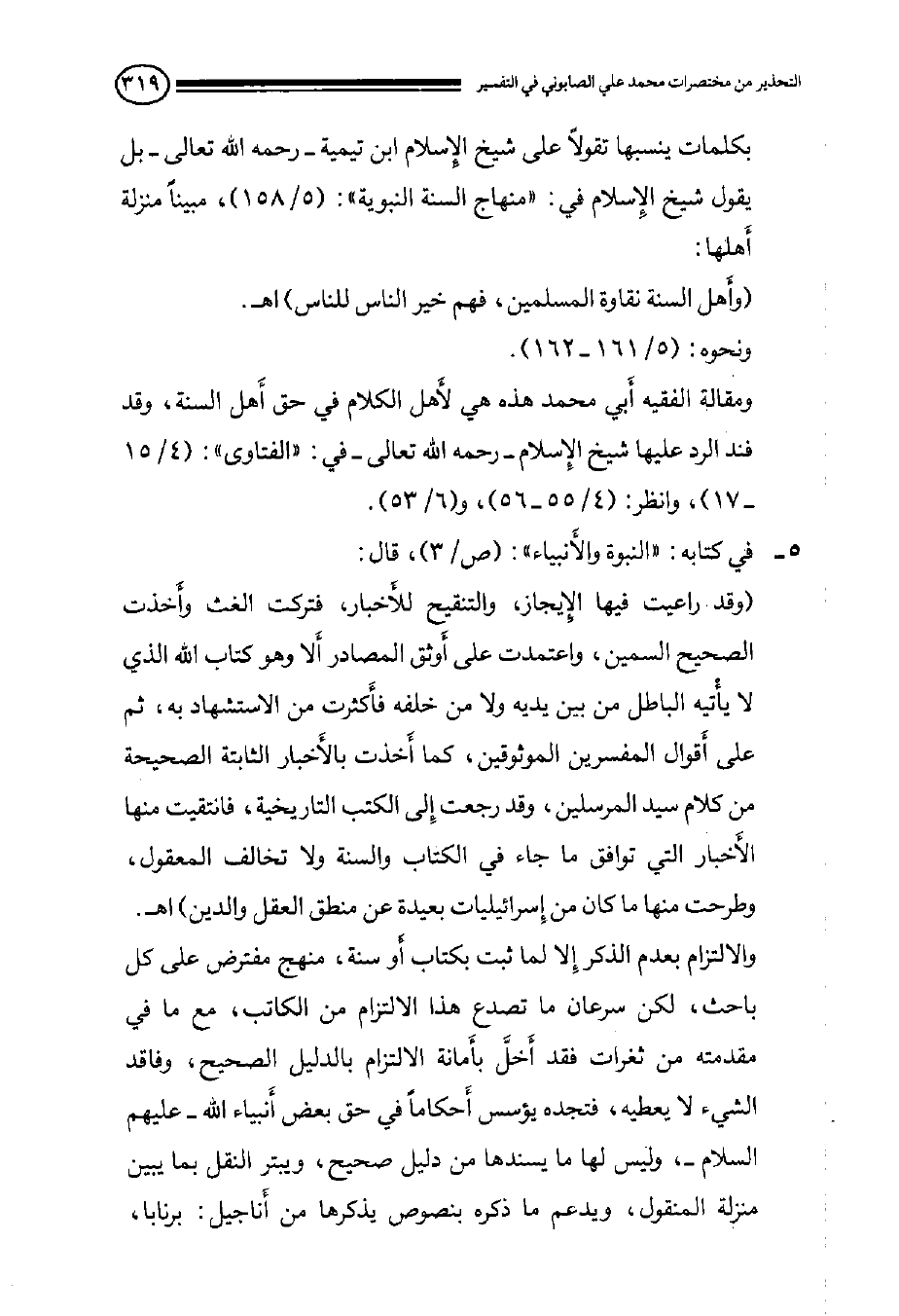 5- في كتابه: ((النبوة والأَنبياء)) : (ص / 3) , قال: (وقد راعيت فيها الإِيجاز, والتنقيح للأَخبار, فتركت الغث وأَخذت الصحيح السمين, واعتمدت على أَوثق المصادر أَلا وهو كتاب الله الذي لا يأْتيه الباطل من بين يديه ولا من خلفه فأَكثرت من الاستشهاد به, ثم على أَقوال المفسرين الموثوقين, كما أَخذت بالأَخبار الثابتة الصحيحة من كلام سيد المرسلين, وقد رجعت إِلى الكتب التاريخية, فانتقيت منها الأَخبار التي توافق ما جاء في الكتاب والسنة ولا تخالف المعقول, وطرحت منها ما كان من إِسرائيليات بعيدة عن منطق العقل والدين) اهـ.