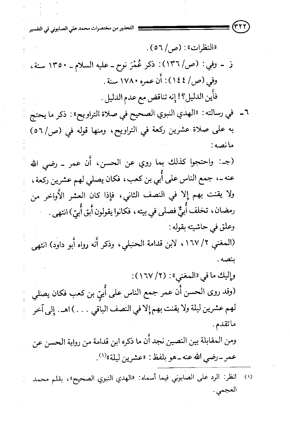 (جـ: واحتجوا كذلك بما روي عن الحسن, أَن عمر - رضي الله عنه - جمع الناس على أُبي بن كعب, فكان يصلي لهم عشرين ركعة, ولا يقنت بهم إِلا في النصف الثاني, فإِذا كان العشر الأَواخر من رمضان, تخلف أُبيٌّ فصلى في بيته, فكانوا يقولون أَبق أُبيّ) انتهى. وعلق في حاشيته بقوله: (المغني 2/ 167, لابن قدامة الحنبلي, وذكر أَنه رواه أَبو داود) انتهى بنصه. وإِليك ما في ((المغني)) : (2/ 167) : (وقد روى الحسن أَن عمر جمع الناس على أُبّيِ بن كعب فكان يصلي لهم عشرين ليلة ولا يقنت بهم إِلا في النصف الباقي. . .) اهـ. إِلى آخر ما تقدم. ومن المقابلة بين النصين نجد أَن ما ذكره ابن قدامة من رواية الحسن عن عمر – رضي الله عنه - هو بلفظ: ((عشرين ليلة)) (¬1) .