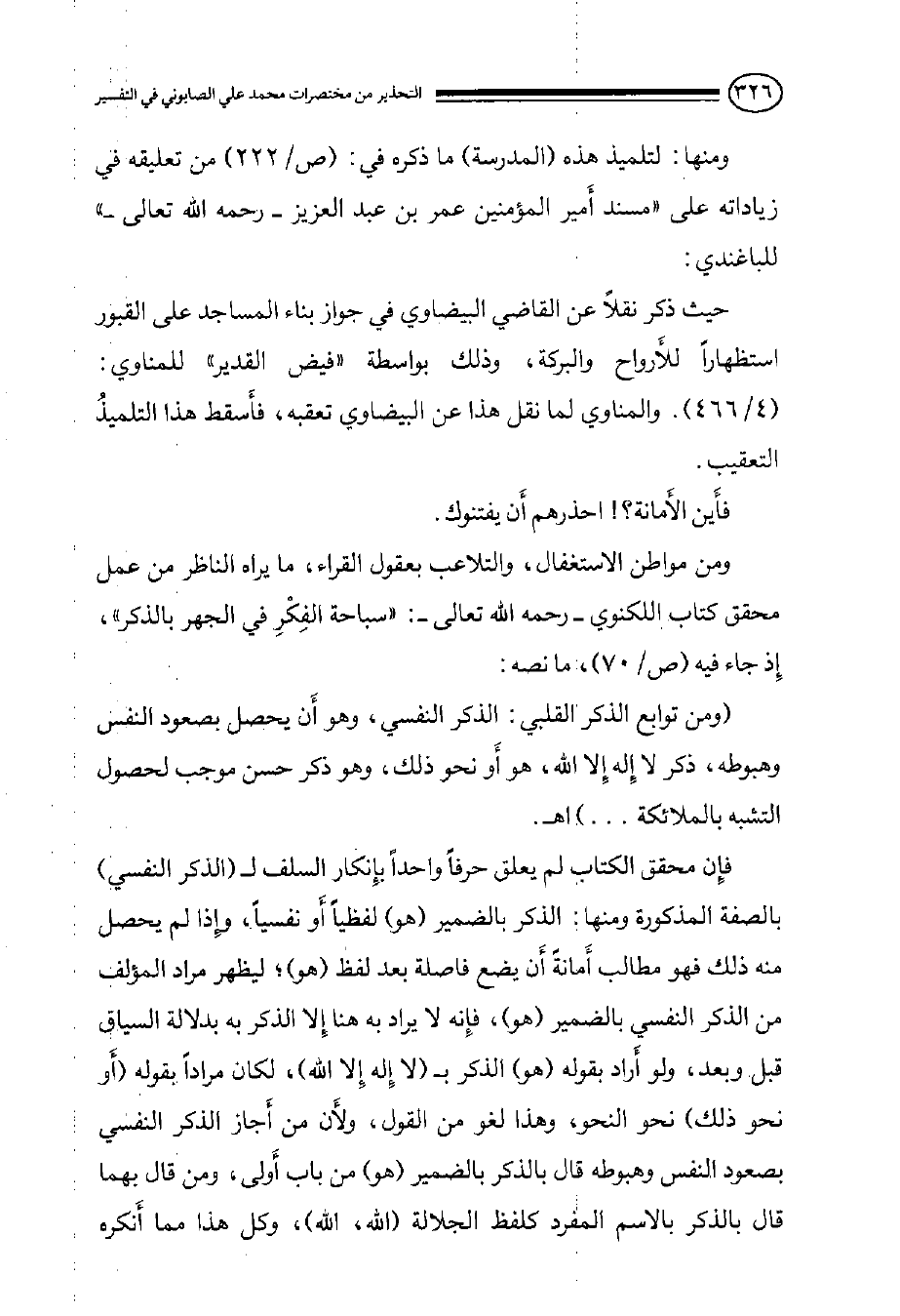 ومنها: لتلميذ هذه (المدرسة) ما ذكره في: (ص / 222) من تعليقه في زياداته على ((مسند عمر بن عبد العزيز – رحمه الله تعالى -)) للباغندي: حيث ذكر نقلاً عن القاضي البيضاوي في جواز بناء المساجد على القبور استظهاراً للأَرواح والبركة, وذلك بواسطة ((فيض القدير)) للمناوي: (4/ 466) . والمناوي لما نقل هذا عن البيضاوي تعقبه, فأَسقط هذا التلميذُ التعقيب. فأَين الأَمانة؟! احذرهم أَن يفتنوك.