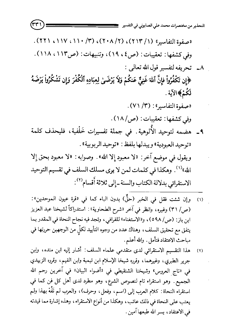 8- تحريفه لتفسير قول الله تعالى: {إِنْ تَكْفُرُوا فَإِنَّ اللَّهَ غَنِيٌّ عَنْكُمْ وَلا يَرْضَى لِعِبَادِهِ الْكُفْرَ وَإِنْ تَشْكُرُوا يَرْضَهُ لَكُمْ} الآية. ((صفوة التفاسير)) : (3/ 71) . وفي كشفها: تعقيبات: (ص / 18) .