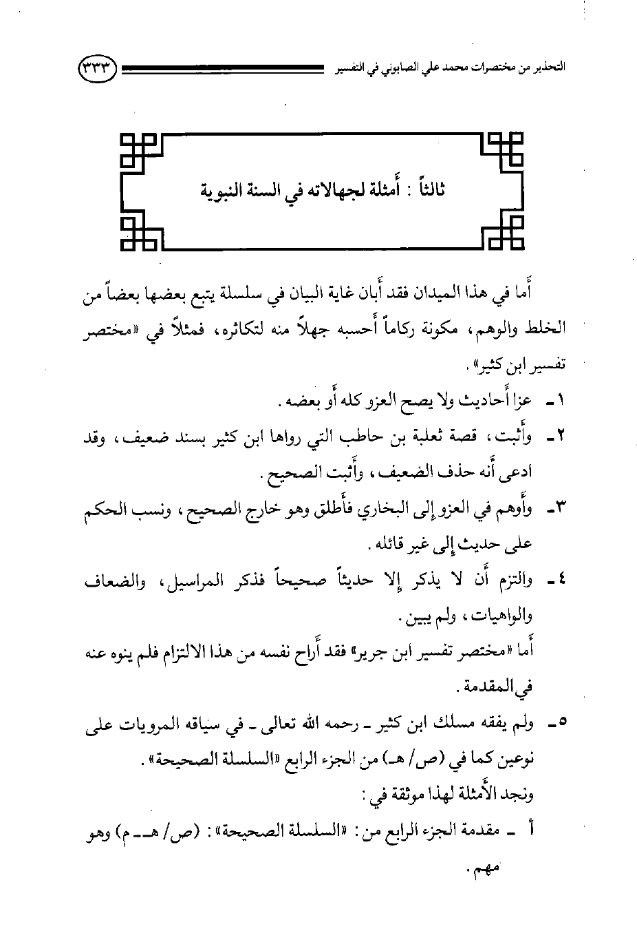 أَما في هذا الميدان فقد أَبان غاية البيان في سلسة يتبع بعضها بعضاً من الخلط والوهم, مكونة ركاماً أَحسبه جهلاً منه لتكاثره, فمثلاً في ((مختصر تفسير ابن كثير)) .