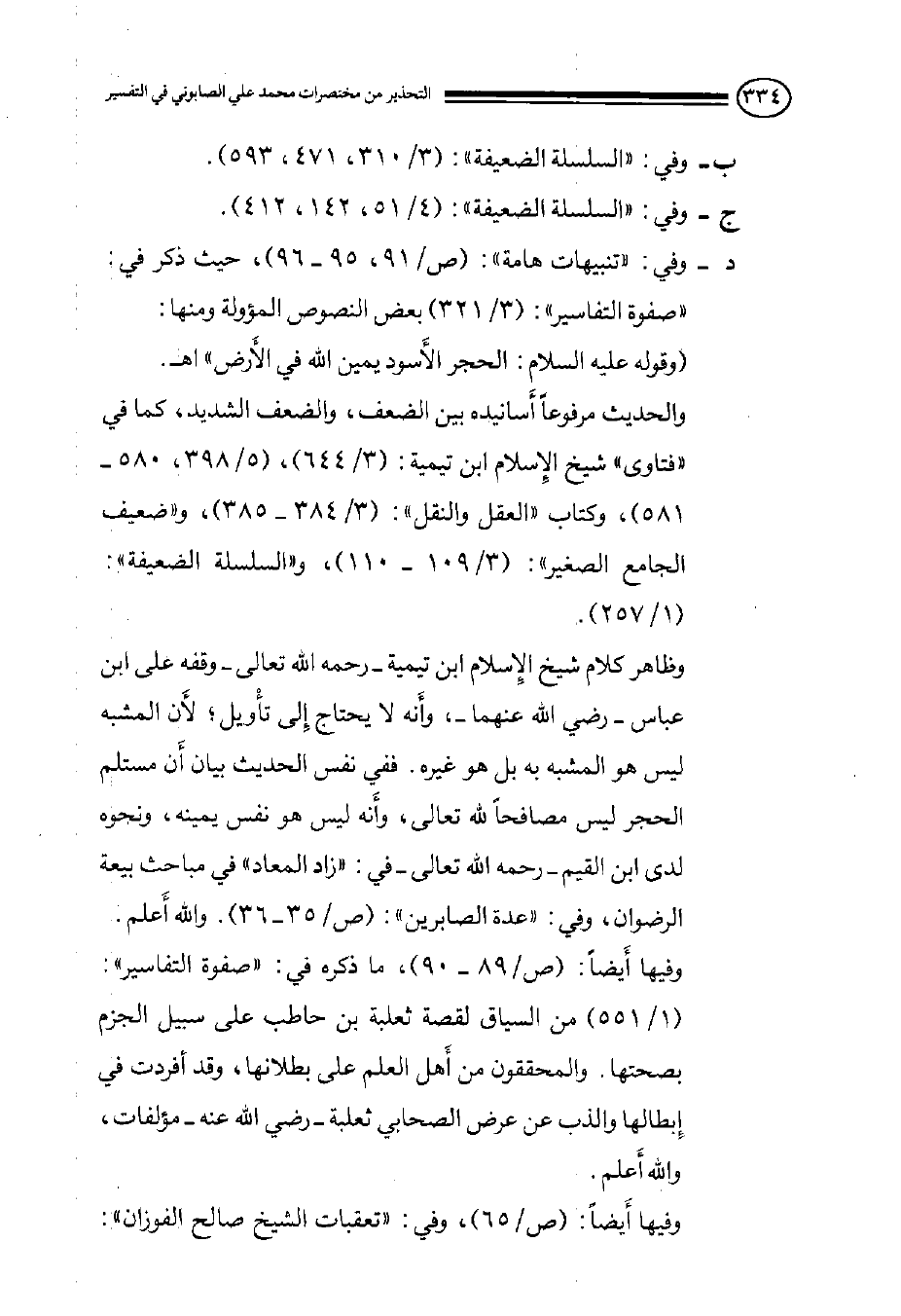 د- وفي: ((تنبيهات هامة)) : (ص / 91, 95, 96) , حيث ذكر في: ((صفوة التفاسير)) : (3/ 321) بعض النصوص المؤولة ومنها: (قوله عليه السلام: الحجر الأَسود يمين الله في الأَرض)) اهـ. والحديث مرفوعاً أَسانيده بين الضعف, والضعف الشديد, كما في ((فتاوى)) شيخ الإِسلام ابن تيمية: (3/ 644) , (5/ 398, 580, 581) , وكتاب ((العقل والنقل)) : (3/ 109, 110) , و ((السلسة الضعيفة)) : (1/ 257) . وظاهر كلام شيخ الإِسلام ابن تيمية – رحمه الله تعالى - وقفه على ابن عباس – رضي الله عنهما -, وأَنه لا يحتاج إِلى تأْويل, لأَن المشبه ليس هو المشبه به بل هو غيره ففي نفس الحديث بيان أَن مستلم الحجر ليس مصافحاً لله تعالى, وأَنه ليس هو نفس يمينه, ونحوه لدى ابن القيم – رحمه الله تعالى - في: ((زاد المعاد)) في مباحث بيعة الرضوان , وفي: ((عدة الصابرين)) : (ص / 35, 36) . والله أَعلم.