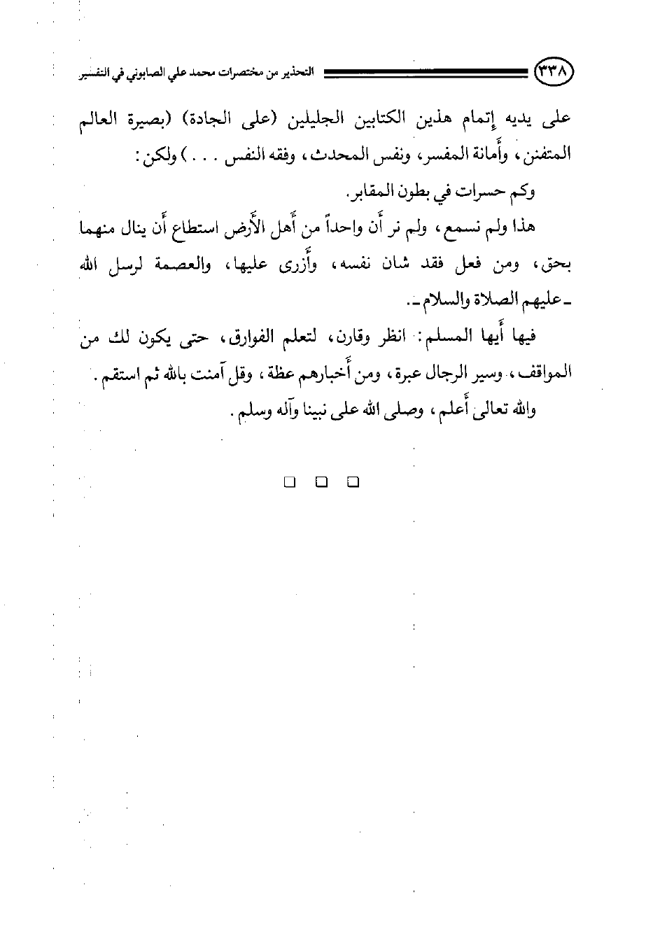 على يديه إِتمام هذين الكتابين الجليلين (على الجادة) (بصيرة العالم المتفنن, وأَمانة المفسر, ونفس المحدث, وفقه النفس. . .) ولكن: وكم حسرات في بطون المقابر. هذا ولم نسمع, ولم نر أَن واحداً من أَهل الأَرض استطاع أَن ينال منهما بحق, ومن فعل فقد شان نفسه, وأَزرى عليها, والعصمة لرسل الله – عليهم الصلاة والسلام -. فيا أَيها المسلم: انظر وقارن, لتعلم الفوارق, حتى يكون لك من المواقف, وسير الرجال عبرة, ومن أَخبارهم عظة, وقل آمنت بالله ثم اسقم. والله تعالى أَعلم, وصلى الله على نبينا وآله وسلم.